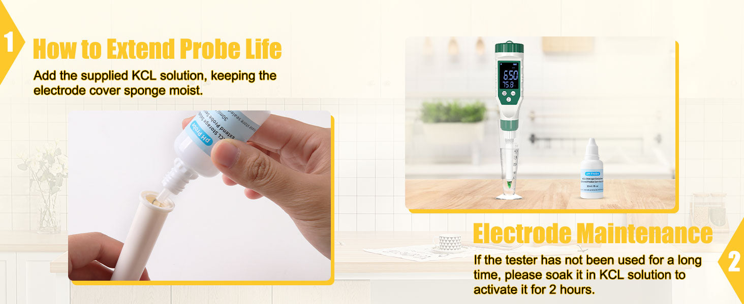 Digital pH tester with ATC system and LCD display screen. With the latest chips and algorithms, you can get faster readings and more stable results. What's more, we've customized a bottle of KCL solution that will greatly increase your pH tester's life by simply keeping the electrode cap sponge moist.
