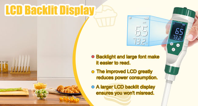 The digital pH meter's white backlit LCD design makes it easy to read test results in any light; the improved display not only reduces power consumption but also greatly improves readability.
