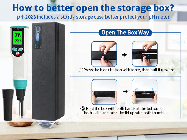 With two-point automatic calibration of 4.00, and 6.86, it is easy to calibrate; With automatic temperature compensation of 32.0—122.0℉, it avoids measurement inaccuracies caused by liquid temperature changes; With automatic shut-down, its battery life is well preserved. Up to 1500hours of continuous operation, powered by 2 AAA batteries.