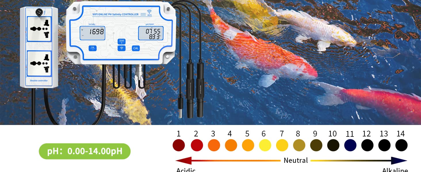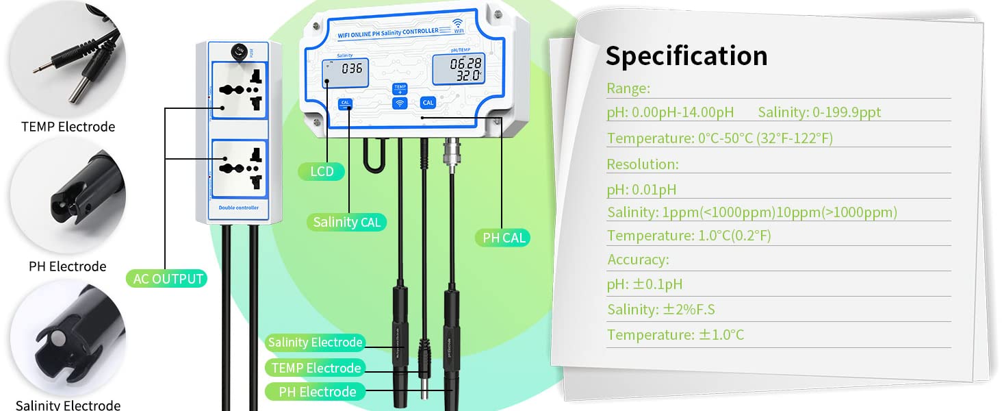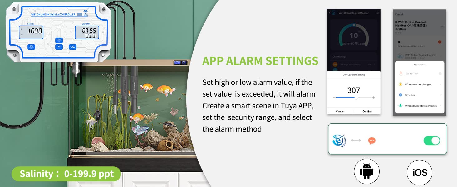 Powered by AC Power, ideal for long-term water quality monitoring and controlling. the App can set the upper and lower limits of pH and salinity, which can be set according to your needs. when the value you set exceeds the test range, the application interface will give an abnormal alarm, notifying you of any values exceeding your preset range.