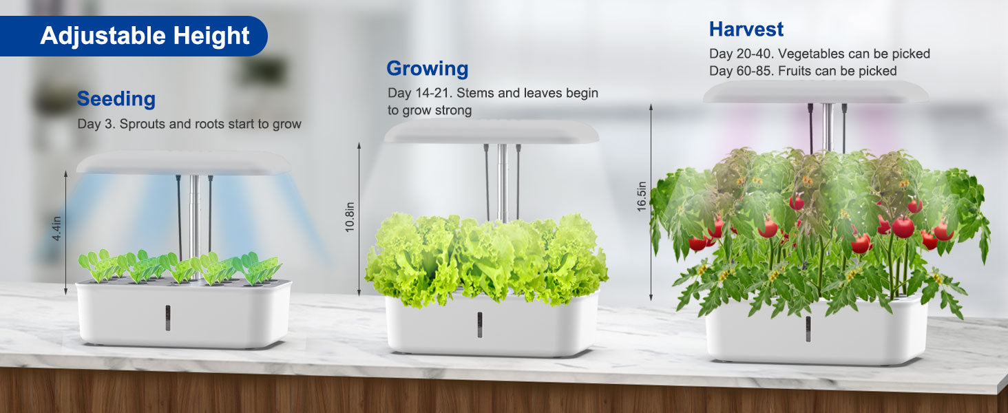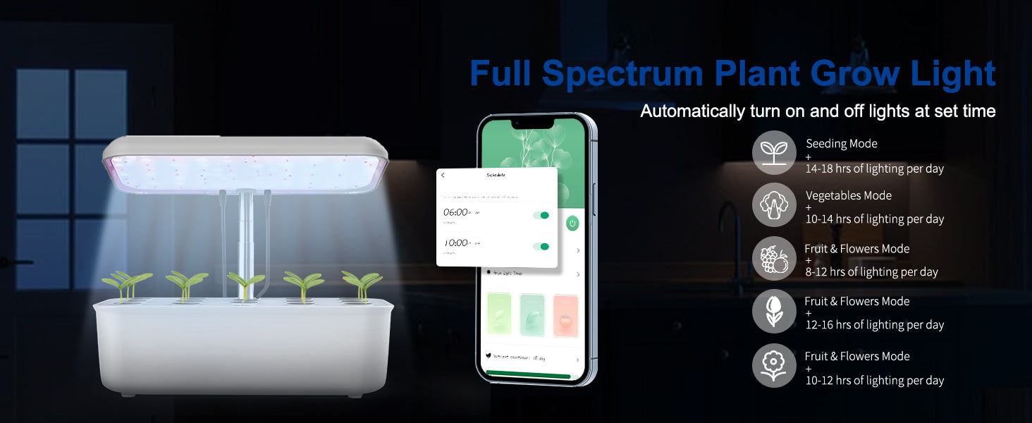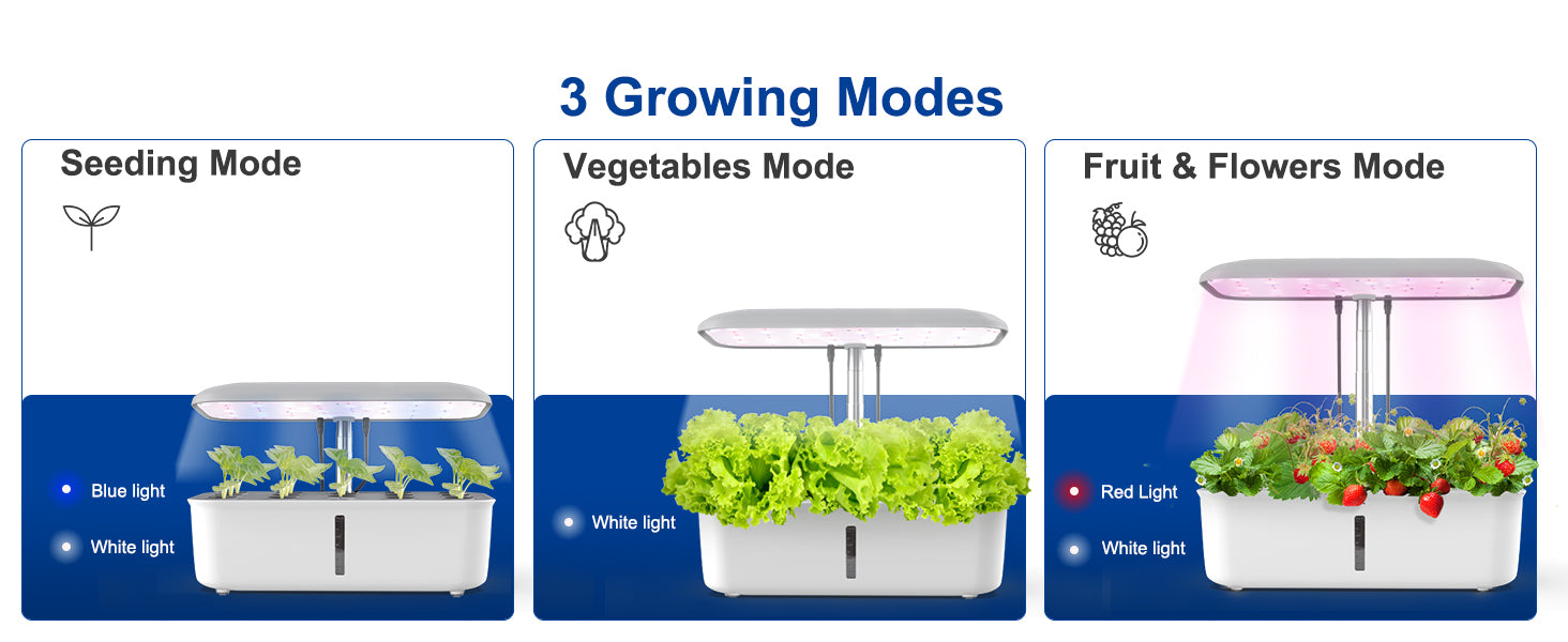 Seedling mode, green leaf mode and flower and fruit mode. Three modes cover the plant growth cycle. Hydroponic system uses full-spectrum lights to simulate natural sunlight. Seedling mode allows your seeds to grow leaves and roots faster. Vegetable pattern helps plants promote leaf growth by enhancing blue light. Flower/Fruit mode enhances red light to promote the production of anthocyanins, allowing plants to flower and produce fruit.