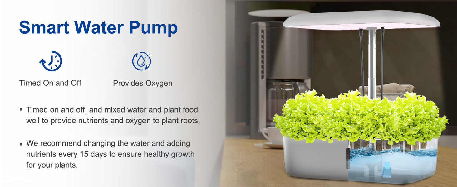 Super quiet independent water pump forms a water circulation system, and the flowing water improves the oxygen content. Speeds up the plants' absorption of nutrient solution, allowing them to thrive under the light of the hydroponic growth system. You can adjust the running time of the pump according to the different growth stages of the plants through the app.