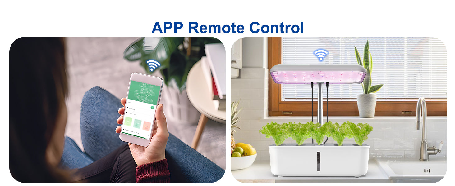 Equipped with WiFi smart hydroponic growing system, you can control the plant grow light anytime and anywhere via APP. Adjust the light and pump running time according to different growing stages. [Smart Control] - Smart hydroponic growing system with smart WIFI remote control and time setting. Support WIFI network, remote control, intelligent reminder, nutrient liquid countdown reminder. Water pump, intelligent lighting timing, real-time adjustment according to demand, support voice control alexa, Google Assistant.